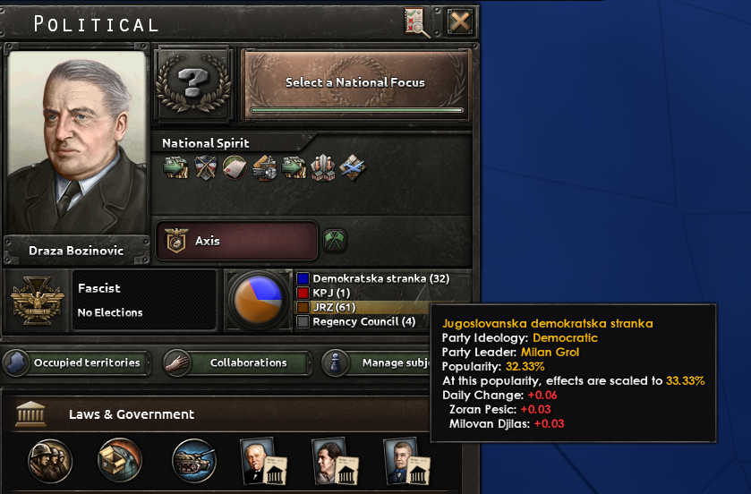 Each country belongs to one of the four ideology groups (usually referred to simply as ideologies). These are difficult to change and affect the circumstances under which a country can perform certain actions, as well as what happens to occupied territory.