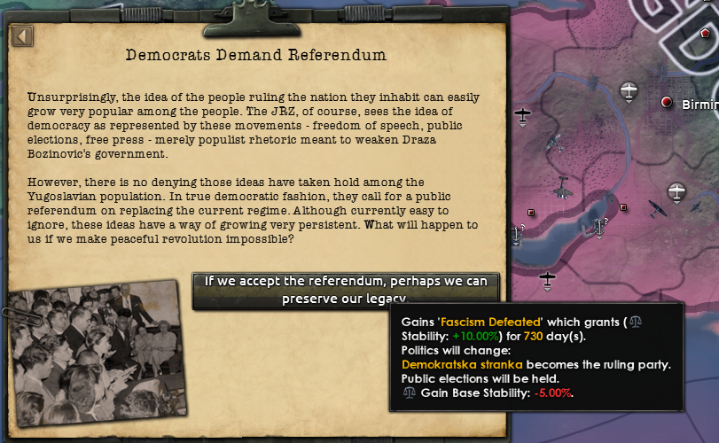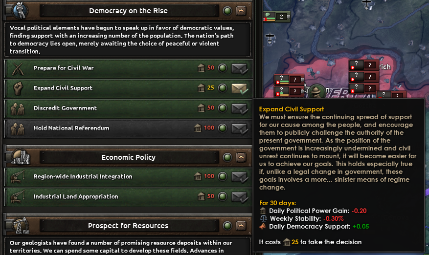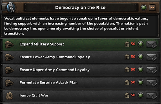 Once that ideology reaches around 20–25% popularity in your country, you will gain access to decisions to either start a civil war or continue working toward a peaceful transition of power.